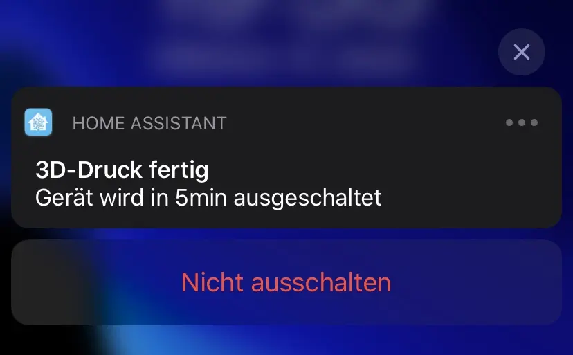 Ich besitze seit kurzem einen 3D Drucker - Artillery Genius. Ein ordentlicher Druck dauert mehrere Stunden und ist oftmals erst mitten in der Nacht fertiggestellt. Deshalb habe ich eine Automation in Home Assistant erstellt, welche mir per iOS Push Notification mitteilt, dass mein Druck fertig ist und per Default den Drucker nach 5 Minuten ausschaltet. Innerhalb dieser 5 Minuten habe ich die Möglichkeit den Ausschaltvorgang abzubrechen um z.B. einen weiteren Druck zu starten.
