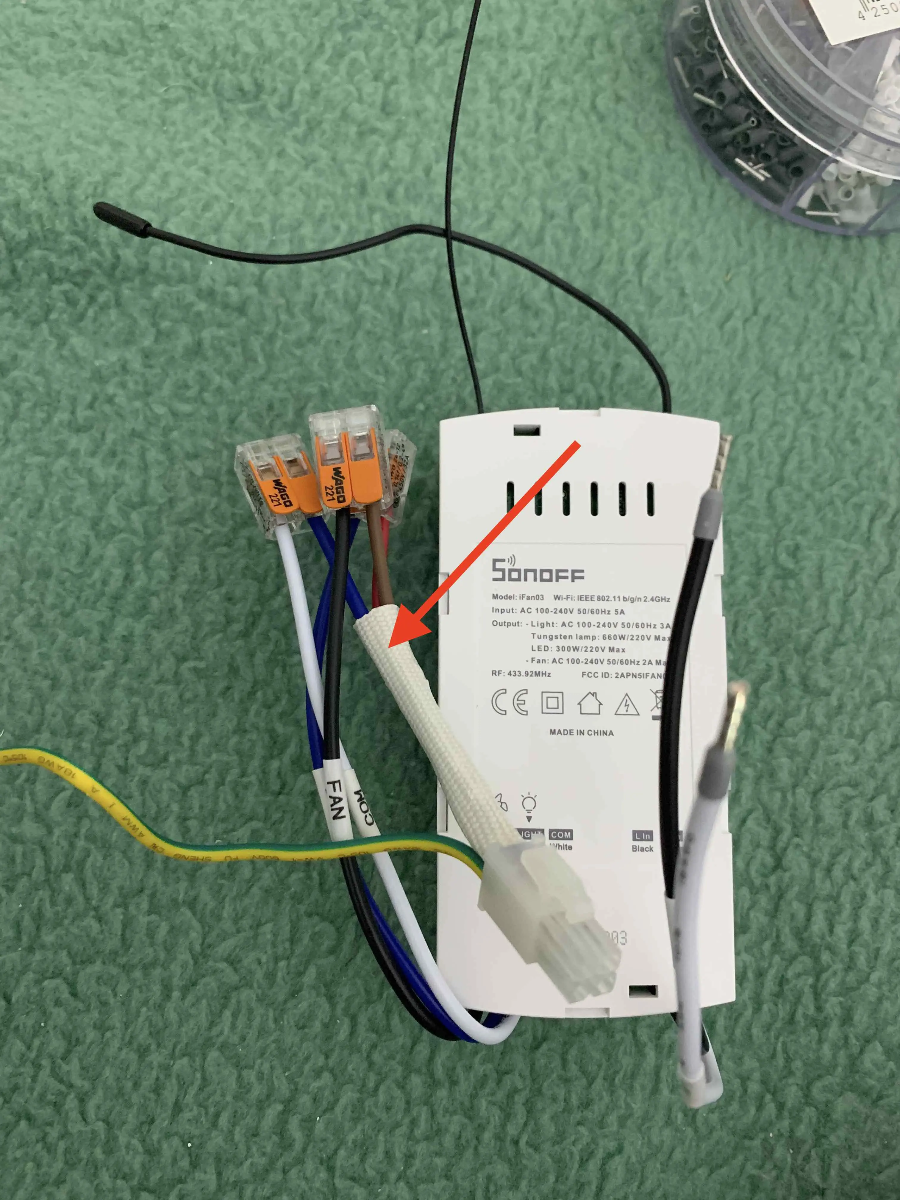 Das Kabel welches am Klemmblock des Decken-Montagesockels angeschlossen ist, habe ich abgeklemmt und mit Wago Klemmen am Sonoff iFan03 verbunden. Somit kann der Sonoff iFan03 direkt per Steckverbindung mit dem Ventilatormotor verbunden werden und es müssen keine neuen Steckverbindungen verbaut werden.