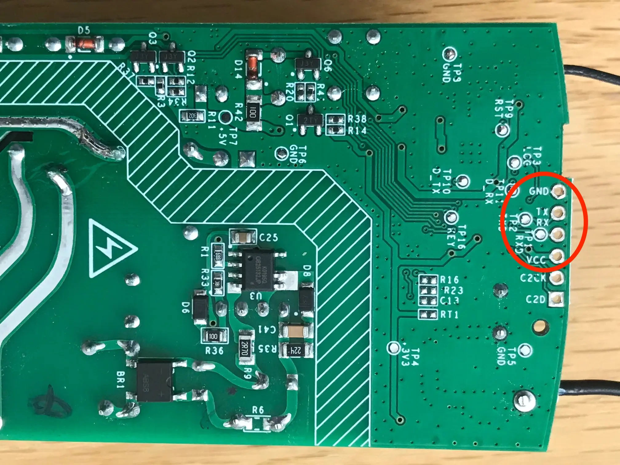 Pinout der Plantine (Rückseite) für den Anschluss der seriellen Schnittstelle.